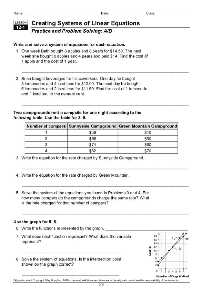 Name ___ Date ___ Class ___ LESSON121Creating Systems of Linear Equations Practice and Problem-Solving: A/Write and solve a system of equations for each situation. 1. One week Beth bought 3 apples