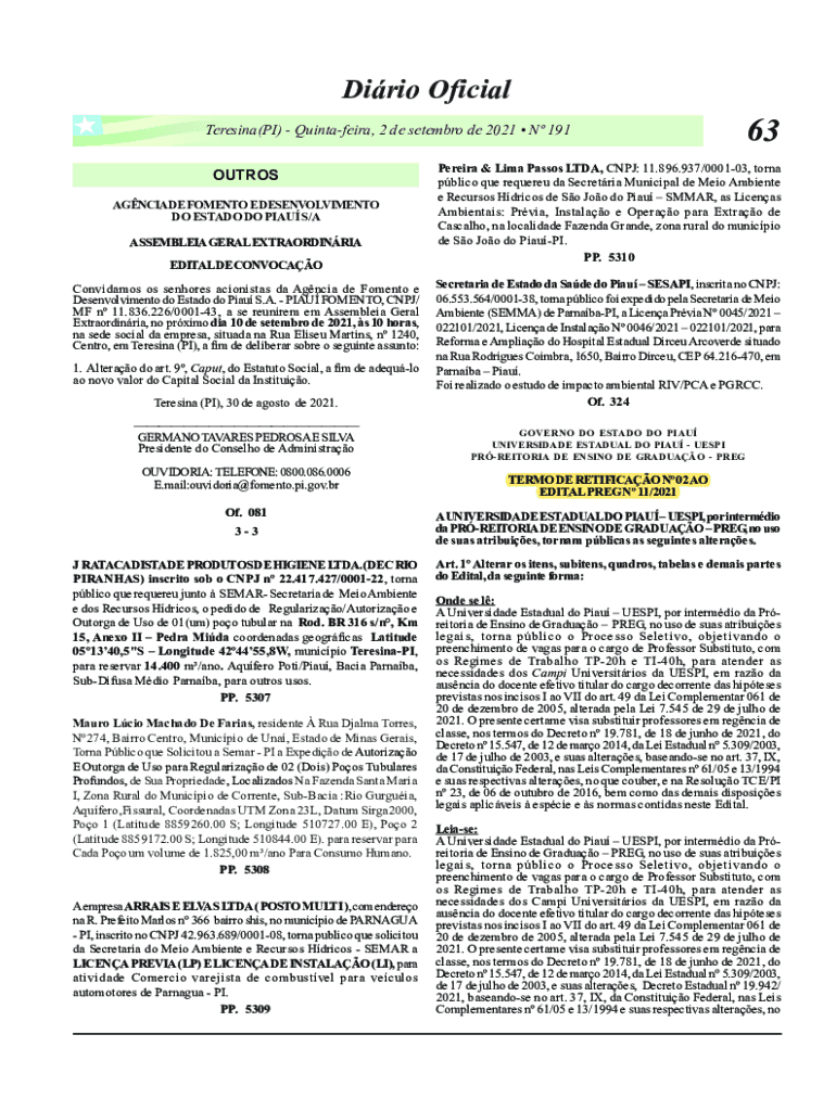 Pcimarkpci MjgwNDowMTRkOjVjZTM6NGExNzowNTI0Ojk1MDk6MzliNDpiZTM4:TW9uLCAwNiBTZXAgMjAyMSAxNjoyMDoyNiAtMDMwMADirio Official Teresina(PI) Quintafeira, 2 de September de 2021 N 191 OUTROS ARCADE FOMENT