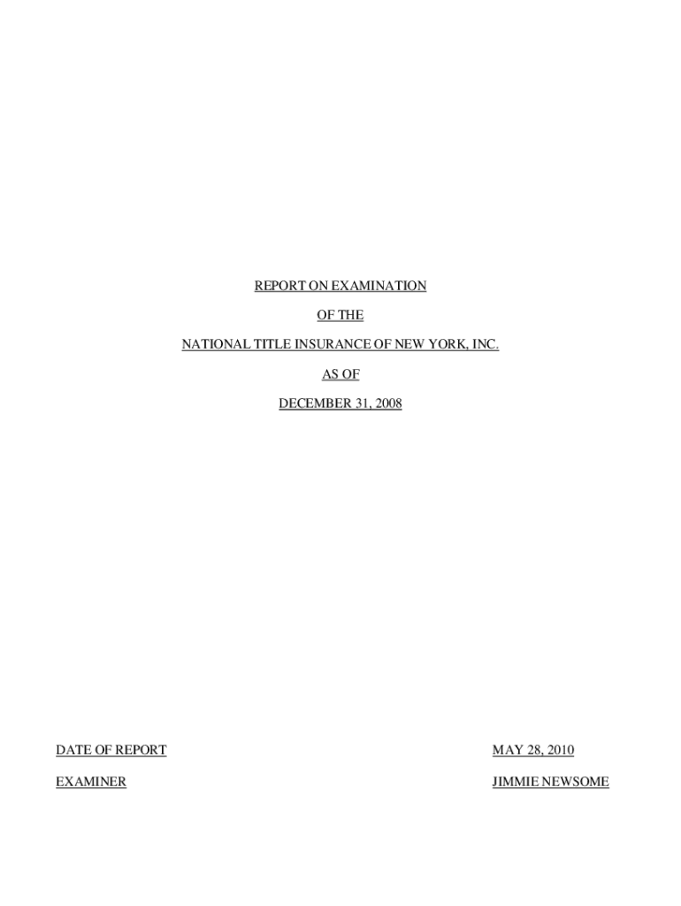 REPORT ON EXAMINATION OF THE NATIONAL TITLE INSURANCE OF NEW YORK, INC. AS OF DECEMBER 31, 2008DATE OF REPORT 28, 2010EXAMINERJIMMIE NEWSOMETABLE OF CONTENTS ITEM NO.PAGE NO.1. Scope of examination22.