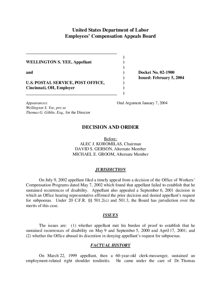 United States Department of Labor Employees Compensation Appeals Board ___ WELLINGTON S. YES, Appellant and U.S. POSTAL SERVICE, POST OFFICE, Cincinnati, OH, Employer ___ Appearances: Wellington S.