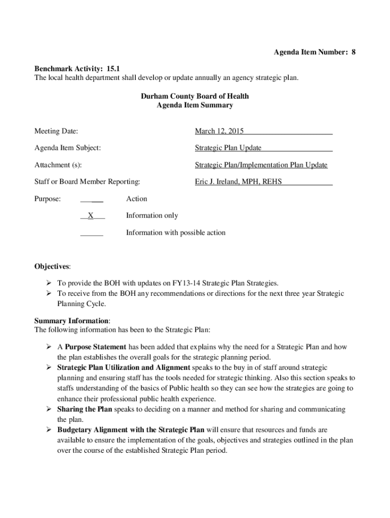 Agenda Item Number: 8 Benchmark Activity: 15.1 The local health department shall develop or update annually an agency strategic plan. Durham County Board of Health Agenda Item Summary Meeting Date:March