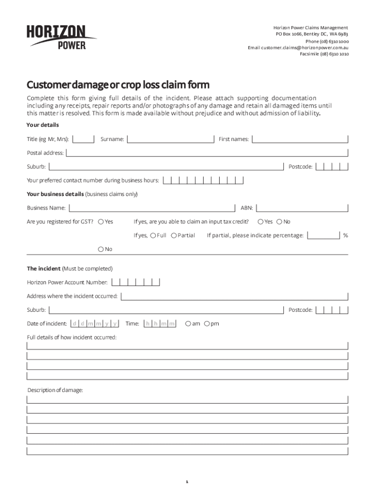 Horizon Power Claims Management PO Box 1066, Bentley DC, WA 6983 Phone (08) 6310 1000 Email customer.claims@horizonpower.com.au Facsimile (08) 6310 1010Customer damage or crop loss claim form Complete