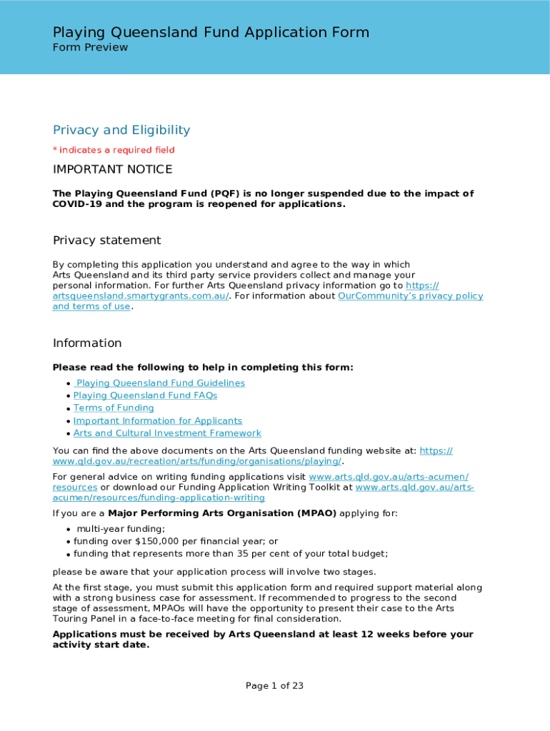Playing Queensland Fund Application Form PreviewPrivacy and Eligibility * indicates a required important NOTICE The Playing Queensland Fund (PDF) is no longer suspended due to the impact of COVID-19