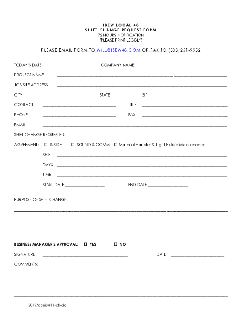 IBEX LOCAL 48 SHIFT CHANGE REQUEST FORM 72 HOURS NOTIFICATION (PLEASE PRINT LEGIBLY) P L E A S E E M AI L F O R M T O W I L @ I B E W 4 8. C O M O R F A × T O (5 0 3) 2 5 1 9 9 5 2 TODAYS DATE___PROJECT
