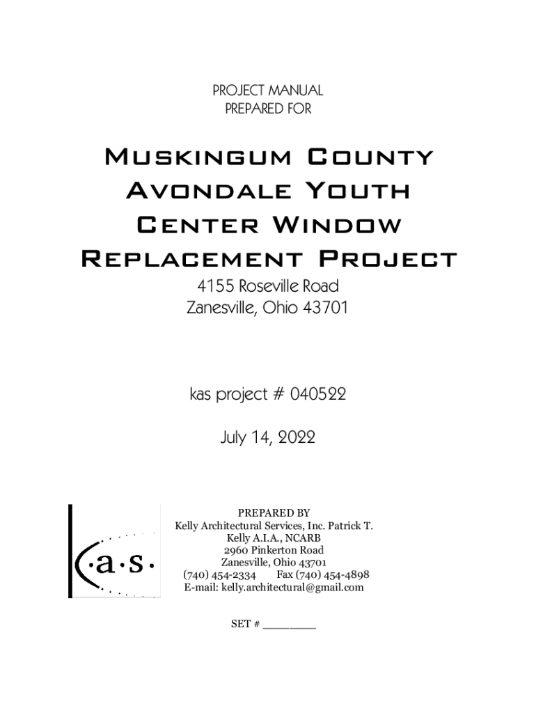PROJECT MANUAL PREPARED FORMuskingum County Avondale Youth Center Window Replacement Project 4155 Roseville Road Janesville, Ohio 43701kas project # 040522 July 14, 2022PREPARED BY Kelly Architectural