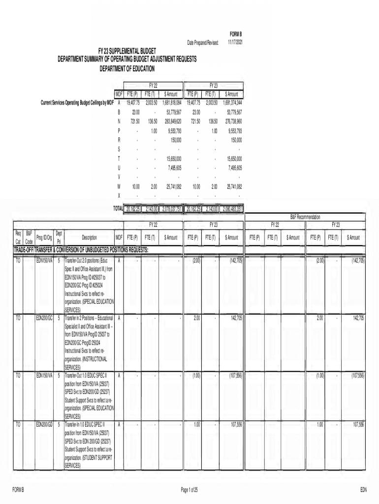 Date Prepared/Revised:FORM B 11/17/2021FY 23 SUPPLEMENTAL BUDGET DEPARTMENT SUMMARY OF OPERATING BUDGET ADJUSTMENT REQUESTS DEPARTMENT OF EDUCATION.r11rMOF Current Services Operating Budget Ceilings