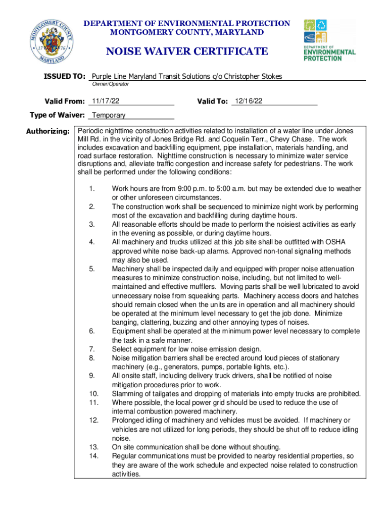 DEPARTMENT OF ENVIRONMENTAL PROTECTION MONTGOMERY COUNTY, MARYLANDNOISE WAIVER CERTIFICATE ISSUED TO: Purple Line Maryland Transit Solutions c/o Christopher Stokes Owner/OperatorValid From: 11/17/22Valid