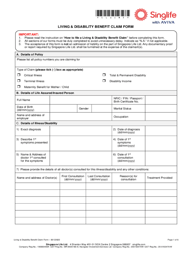 The singlifecomliving-benefit-claim-formliving & disability benefit is a form to claim benefits for living and disability coverage provided by SingLife.
