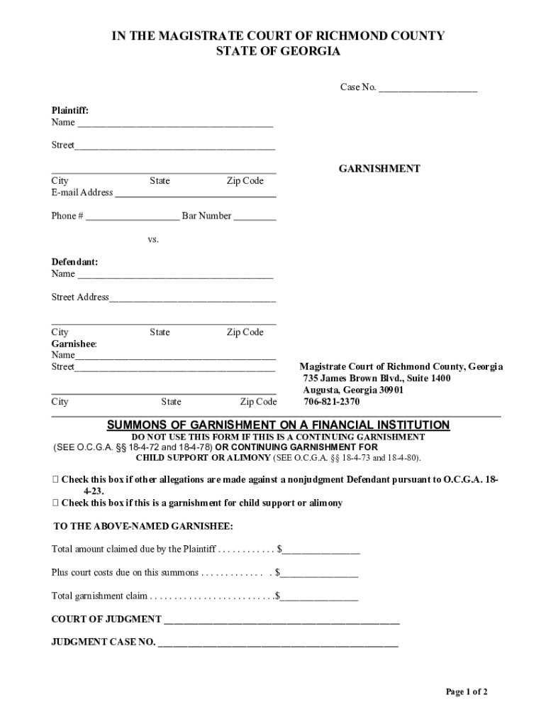 IN THE MAGISTRATE COURT OF RICHMOND COUNTY STATE OF GEORGIA Case No. ___ Plaintiff: Name ___ Street___ City Email AddressStatePhone #Zip CodeGARNISHMENTBar Number vs. Defendant: Name ___ Street Address___