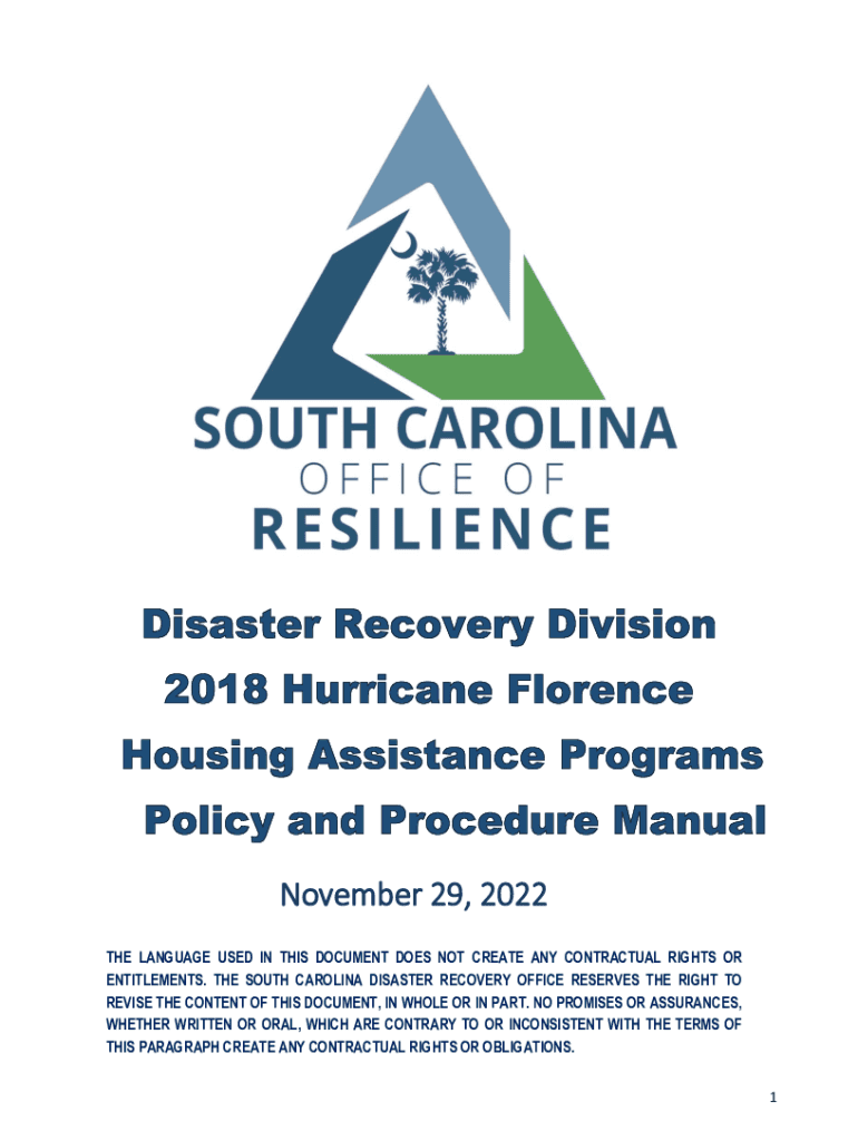 November 29, 2022, THE LANGUAGE USED IN THIS DOCUMENT DOES NOT CREATE ANY CONTRACTUAL RIGHTS OR ENTITLEMENTS. THE SOUTH CAROLINA DISASTER RECOVERY OFFICE RESERVES THE RIGHT TO REVISE THE CONTENT OF