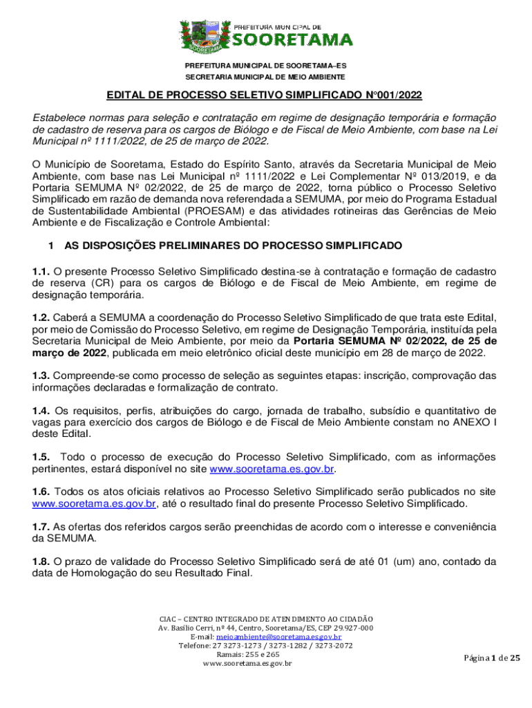 SECRETARIAT MUNICIPAL DE MEMO AMBIENTEEDITAL DE PROCESS SELECTIVE SIMPLIFIED N001/2022