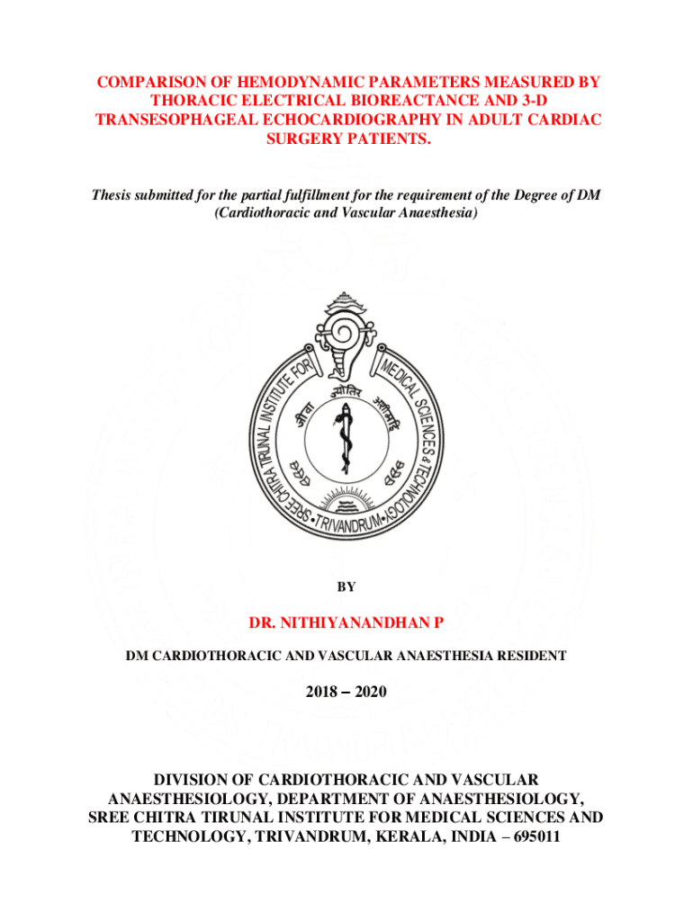 COMPARISON OF HEMODYNAMIC PARAMETERS MEASURED BY THORACIC ELECTRICAL REACTANCE AND 3D TRANSESOPHAGEAL ECHOCARDIOGRAPHY IN ADULT CARDIAC SURGERY PATIENTS. Thesis submitted for the partial fulfillment