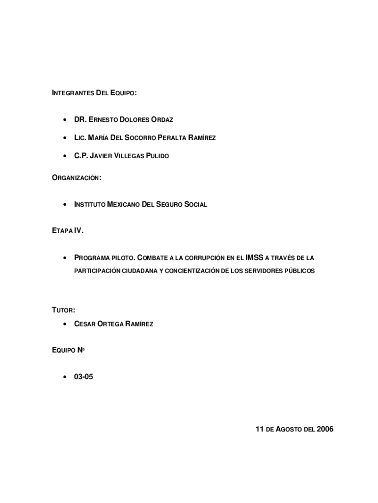 INTEGRATES DEL EQUIP: DR. ERNESTO DOLORES ORGANIC. MARA DEL SOCORRO PENALTY RAMIREZ. P. JAVIER VILLEGAS PULIDOORGANIZACIN: INSTITUTE MEXICAN DEL SEGURA SOCIALETAPA IV. PROGRAM PILOT. COMBAT À la