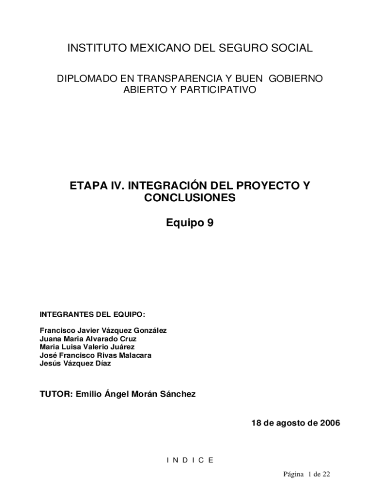 INSTITUTE MEXICAN DEL SEGURA SOCIAL DIPLOMA DO EN TRANSPARENCY Y BEEN GOVERNOR ALBERTO Y PARTICIPATIVOETAPA IV. INTEGRATION DEL PROJECT Y CONCLUSIONS Equip 9INTEGRANTES DEL EQUIP: Francisco Javier