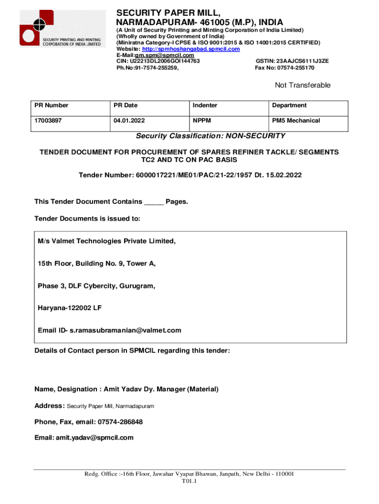 SECURITY PAPER MILL, NARMADAPURAM 461005 (M. P), INDIA (A Unit of Security Printing and Minting Corporation of India Limited) (Wholly owned by Government of India) (Minivan Category CASE & ISO 9001:2015