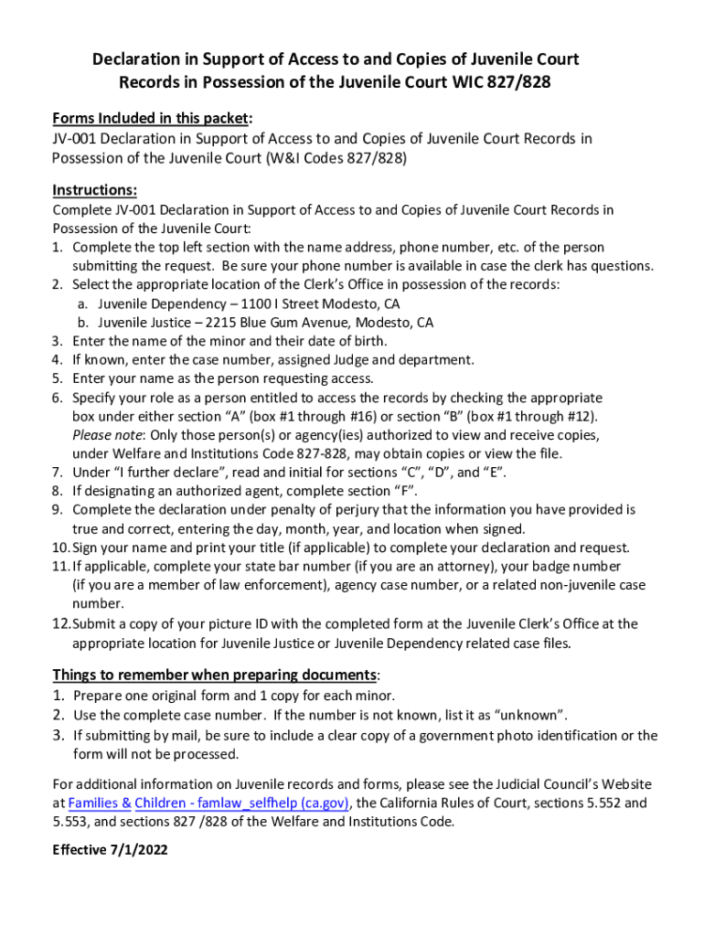 Declaration in Support of Access to and Copies of Juvenile Court Records in Possession of the Juvenile Court WIC 827/828 Forms Included in this packet: JV001 Declaration in Support of Access to and