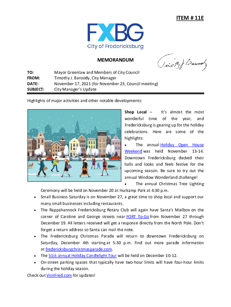ITEM # 11EMEMORANDUM TO: FROM: DATE: SUBJECT:Mayor Green law and Members of City Council Timothy J. Broody, City Manager November 17, 2021 (for November 23, Council meeting) City Managers UpdateHighlights