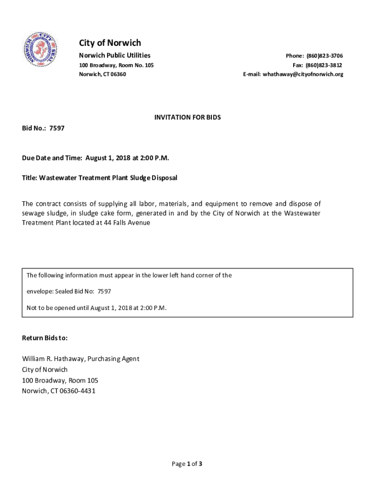 City of Norwich Public UtilitiesPhone: (860)8233706100 Broadway, Room No. 105 Norwich, CT 06360Fax: (860)8233812 Email: whathaway@cityofnorwich.orgINVITATION FOR BIDS Bid No.: 7597Due Date and Time: