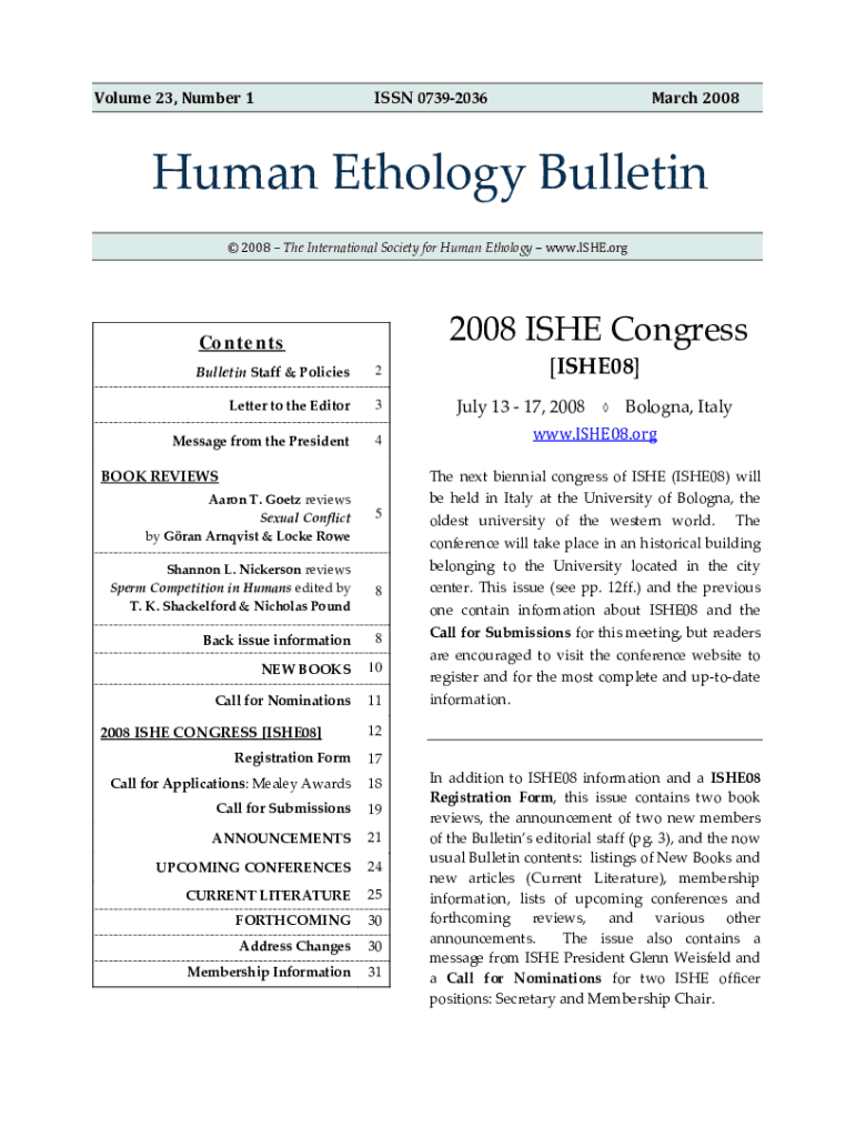 Volume23,Number1ISSN07392036 March2008HumanEthologyBulletin 2008TheInternationalSocietyforHumanEthologywww.SHE.org 2008 SHE Congress Contents[ISHE08]BulletinStaff&Policies2 3LettertotheEditorJuly1317,2008Bologna,Italy