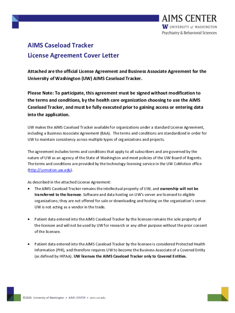 AIMS Caseload Tracker License Agreement Cover Letter Attached are the official License Agreement and Business Associate Agreement for the University of Washington (UW) AIMS Caseload Tracker. Please