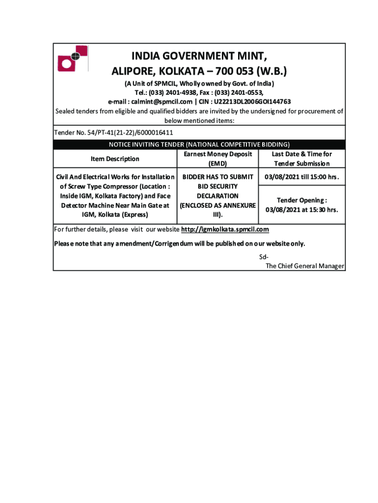 INDIA GOVERNMENT MINT, ADIPOSE, KOLKATA 700 053 (W.B.) (A Unit of SPM CIL, Wholly owned by Govt. of India) Tel.: (033) 24014938, Fax : (033) 24010553, email : calmint@spmcil.com | IN : U22213DL2006GOI144763