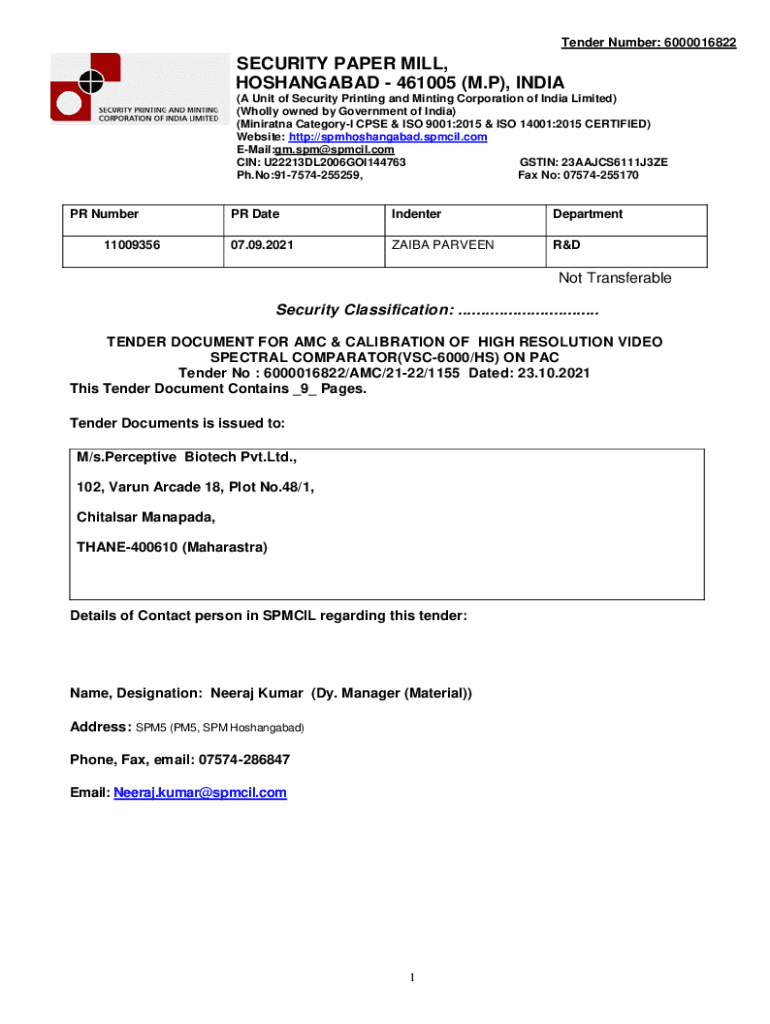 Tender Number: 6000016822SECURITY PAPER MILL, HOSHANGABAD 461005 (M. P), INDIA (A Unit of Security Printing and Minting Corporation of India Limited) (Wholly owned by Government of India) (Minivan