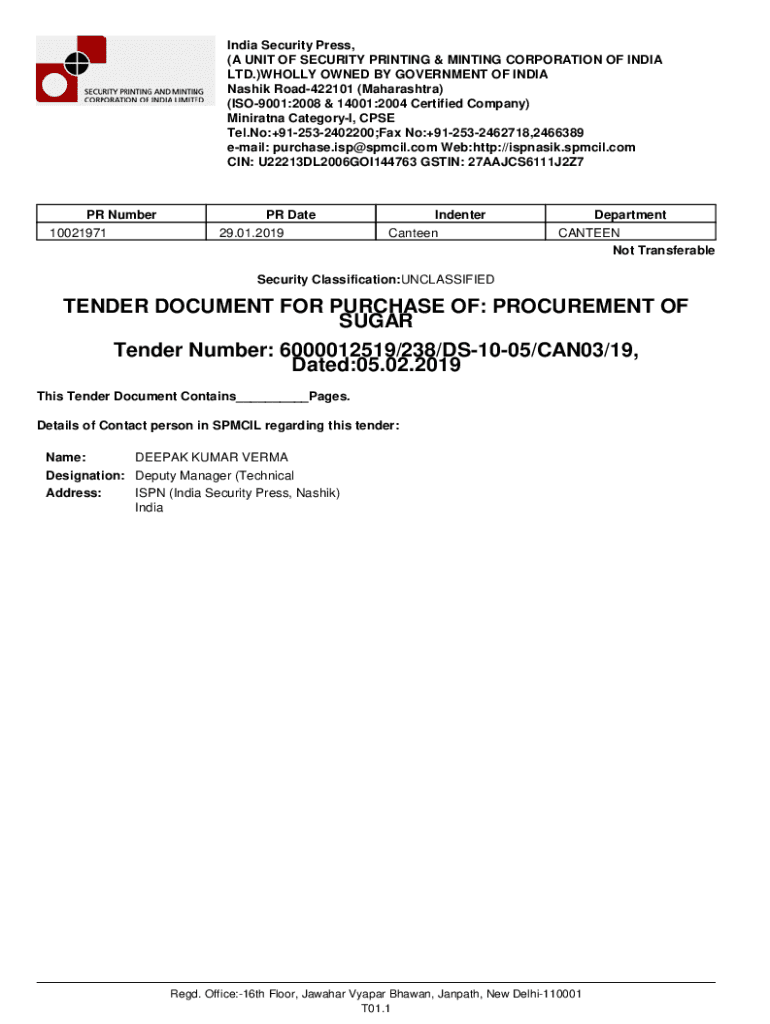 Get the free PROCUREMENT OF SUGAR Tender Number - Spmcil