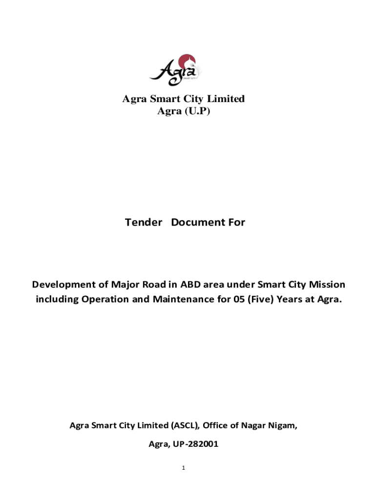 Agra Smart City Limited Agra (U. P)Tender Document Development of Major Road in ABD area under Smart City Mission including Operation and Maintenance for 05 (Five) Years at Agra. Agra Smart City Limited