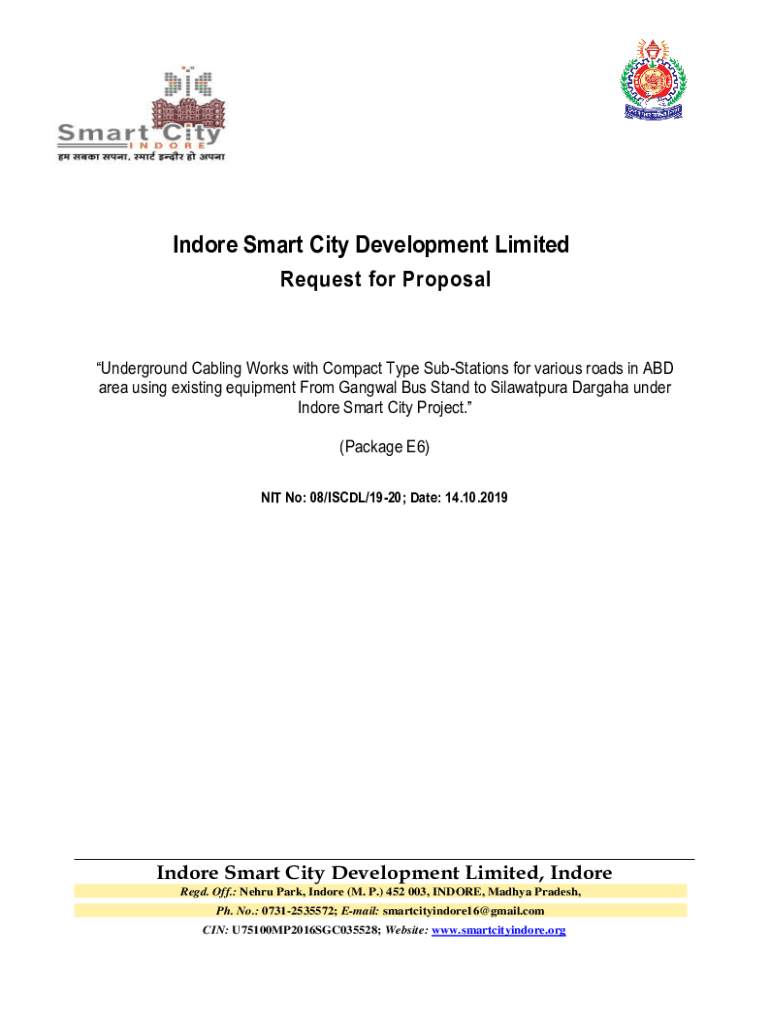Indore Smart City Development Limited Request for ProposalUnderground Cabling Works with Compact Type Substations for various roads in ABD area using existing equipment From Gangway Bus Stand to Silawatpura