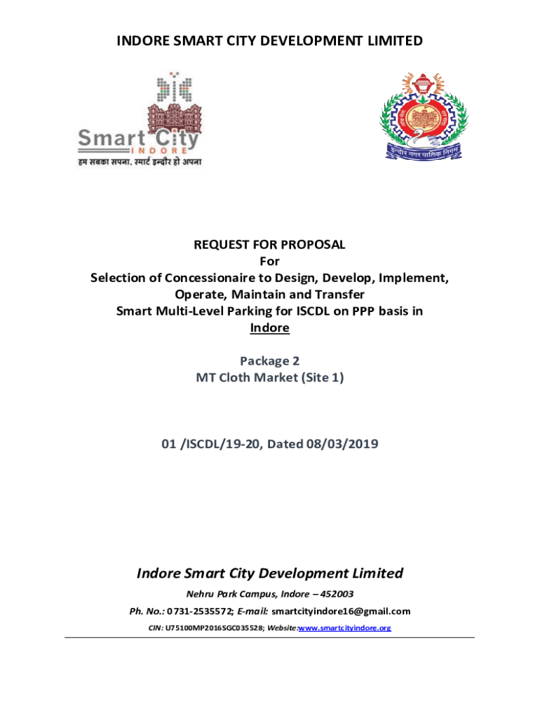 INDORE SMART CITY DEVELOPMENT LIMITEDREQUEST FOR PROPOSAL For Selection of Concessionaire to Design, Develop, Implement, Operate, Maintain and Transfer Smart Multilevel Parking for IS CDL on PPP basis