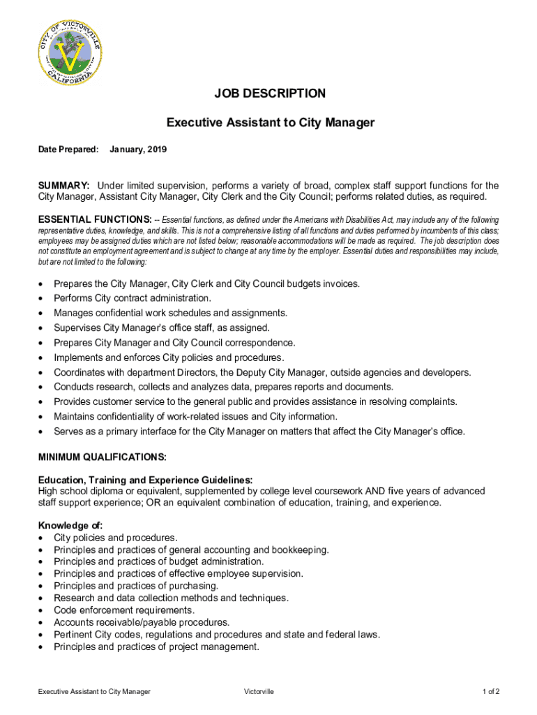 JOB DESCRIPTION Executive Assistant to City Manager Date Prepared:January, 2019SUMMARY: Under limited supervision, performs a variety of broad, complex staff support functions for the City Manager,