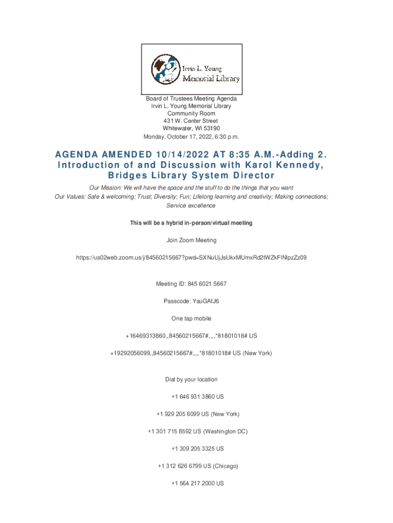 Board of Trustees Meeting Agenda Irvin L. Young Memorial Library Community Room 431 W. Center Street Whitewater, WI 53190 Monday, October 17, 2022, 6:30 p.m.AGENDA AMENDED 10/14/2022 AT 8:35 A.M.