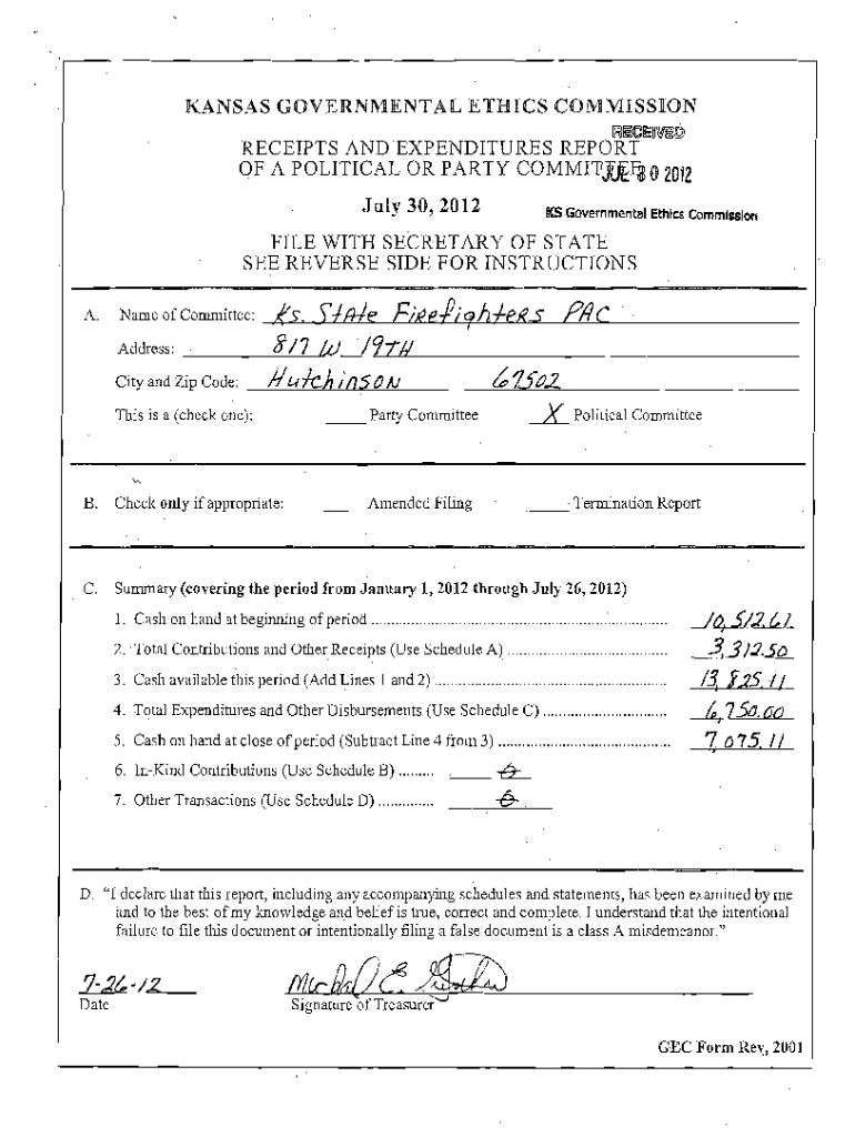 KANSAS GOVERNMENTAL ETHICS COMMISSION tRlfl1rdJRECEIPTS EXPENDITURES REPORT OF A POLITICAL OR PARTY COMMIT\'PJfJEIJ 02012July 30, 2012KS Governmental Ethics Commissionaire WITH SECRETARY OF STATES