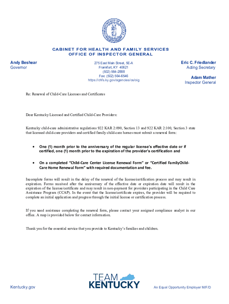 CA BI N E T F O R H E ALT H AN D F A MI L Y S E R VI C E S O FFI C E O F I N S P E CTO R G E N ER Åland Beshear Governor Eric C. Fried lander Acting Secretary275 East Main Street, 5EA Frankfort,