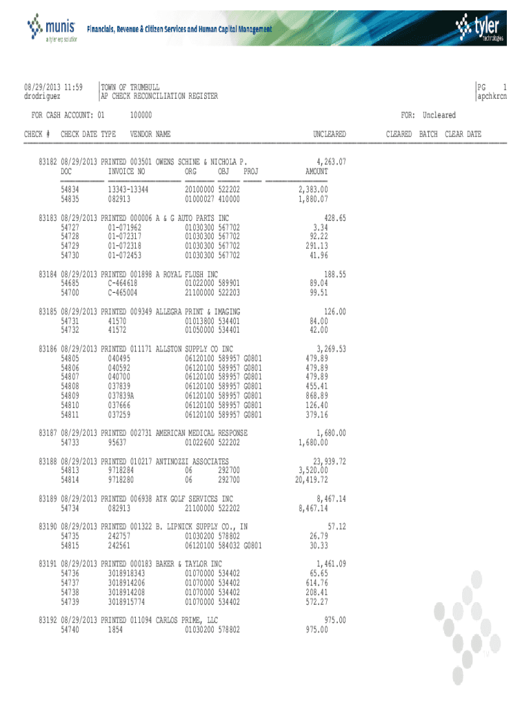 08/29/2013 11:59 Rodriguez|TOWN OF TRUMBULL |AP CHECK RECONCILIATION REGISTERED CASH ACCOUNT: 01|PG 1 |apchkrcn100000FOR:UnclearedCHECK # CHECK DATE TYPE VENDOR NAME UNCLEARED CLEARED BATCH CLEAR