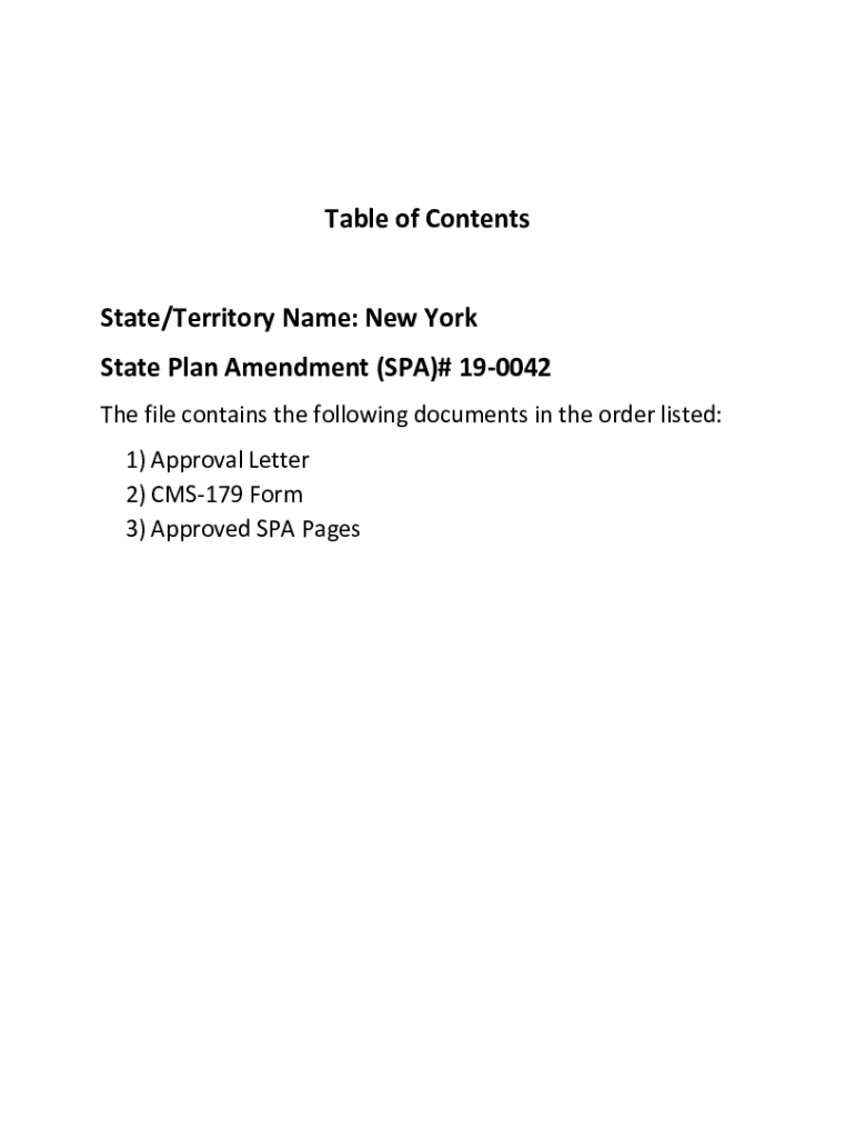 Table of Contents State/Territory Name: New York State Plan Amendment (SPA)# 190042 The file contains the following documents in the order listed: 1) Approval Letter 2) CMS179 Form 3) Approved SPA