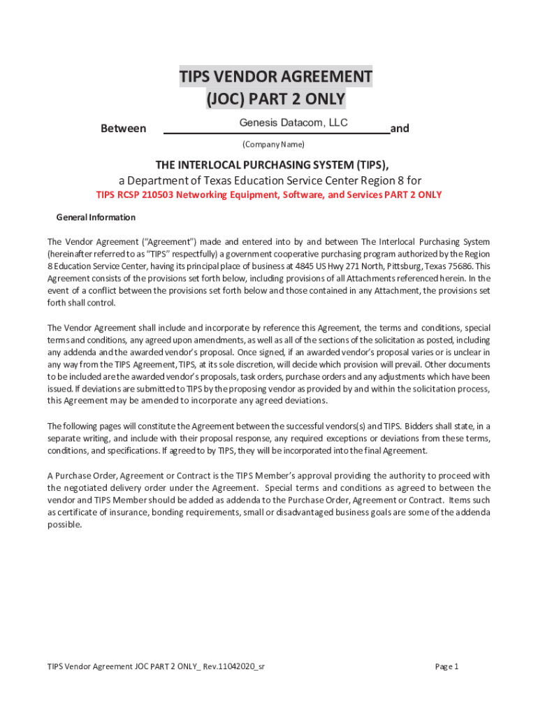 TIPS VENDOR AGREEMENT (JOC) PART 2 ONLY Between Genesis Data com, LLC and(Company Name)THE INTERLOCK PURCHASING SYSTEM (TIPS), a Department of Texas Education Service Center Region 8 for TIPS RCMP