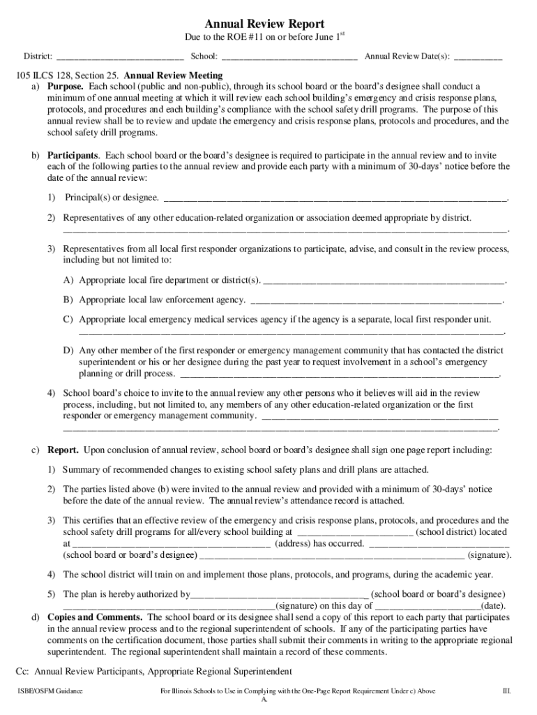 Annual Review Report Due to the ROE #11 on or before June 1st District: ___. School: ___. Annual Review Date(s): ___.105 ILLS 128, Section 25. Annual Review Meeting a) Purpose. Each school (public