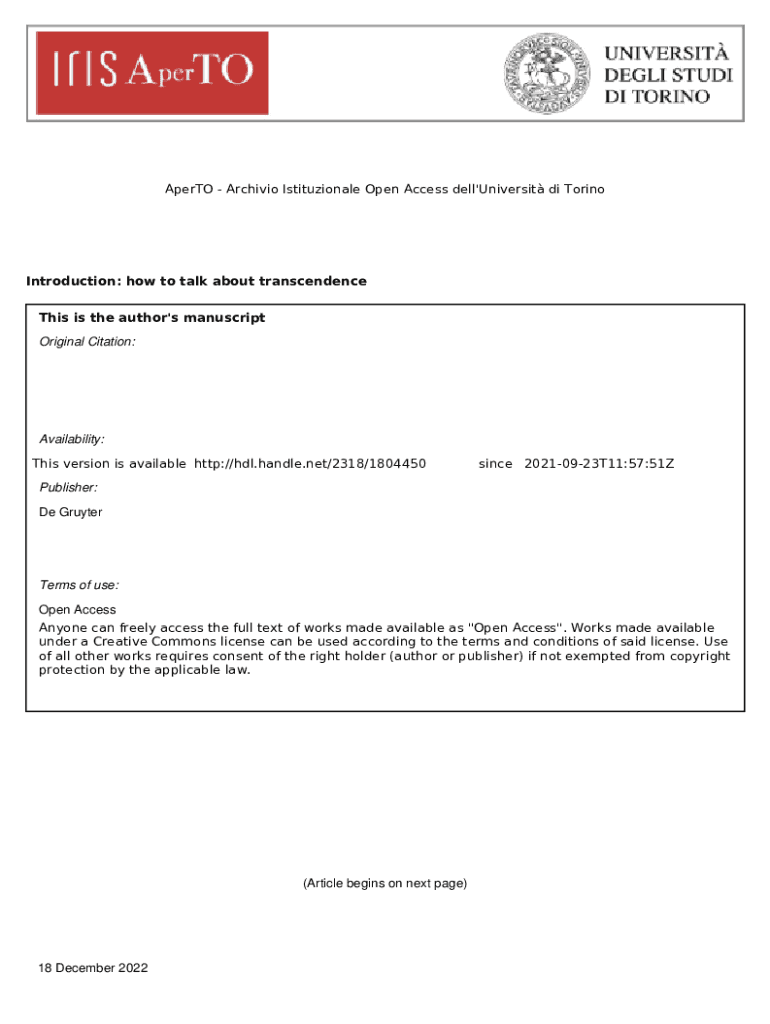 Apart Archive Institutional Open Access dell\'University di TorinoIntroduction: how to talk about transcendence This is the author\'s manuscript Original Citation:Availability: This version is available