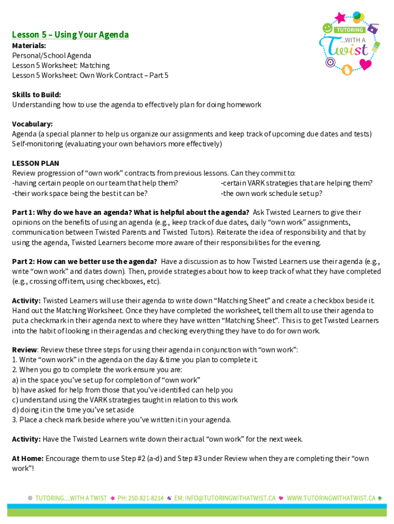 Lesson 5 Using Your AgendaMaterials: Personal/School Agenda Lesson 5 Worksheet: Matching Lesson 5 Worksheet: Own Work Contract Part 5 Skills to Build: Understanding how to use the agenda to effectively