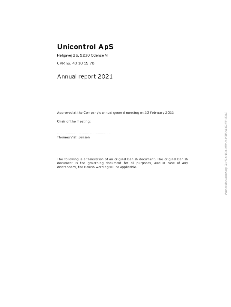Unicontrol APS Heaven 26, 5230 Dense M CVR no. 40 10 15 78Approved at the Company\'s annual general meeting on 23 February 2022 Chair of the meeting: ...................................................
