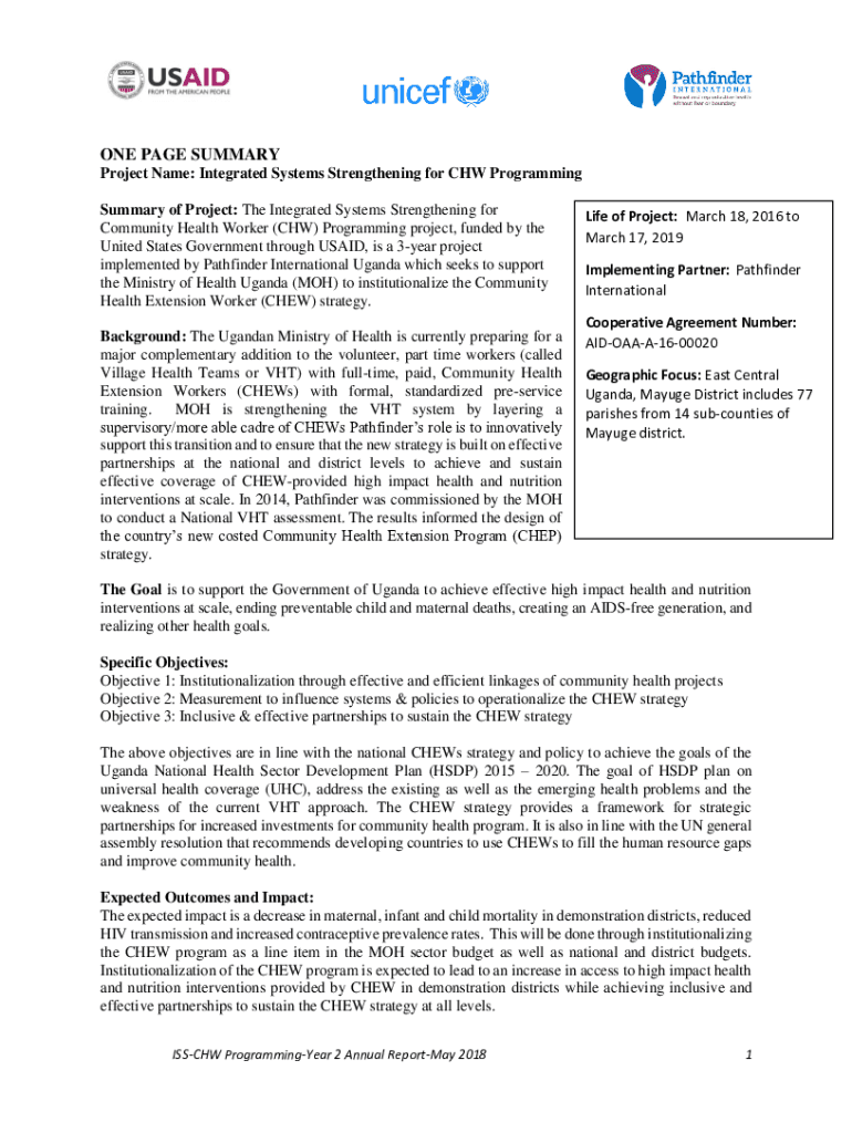ONE PAGE SUMMARY Project Name: Integrated Systems Strengthening for CHW Programming Summary of Project: The Integrated Systems Strengthening for Community Health Worker (CHW) Programming project,