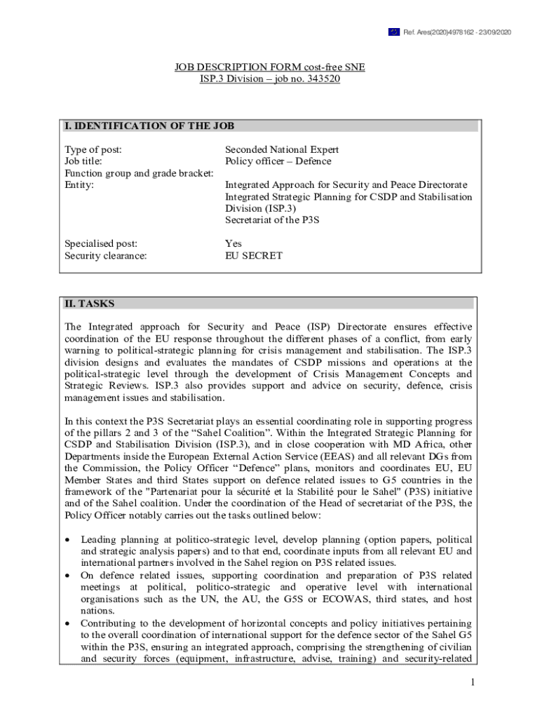 Ref. Ares(2020)4978162 23/09/2020JOB DESCRIPTION FORM cost free SNE ISP.3 Division job no. 343520I. IDENTIFICATION OF THE JOB Type of post: Seconded National Expert Job title: Policy officer Defense