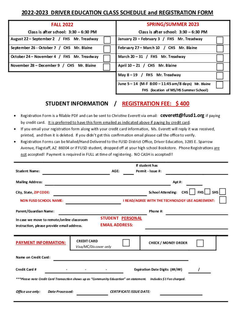 Driver Education Program Christine Everett, Coordinator 3285 E. Sparrow Avenue Flagstaff, AZ 86004 (928) 5276021 ceverett@fusd1.org Visit website: www.fusd1.org Departments & Services / Driver EducationCourse