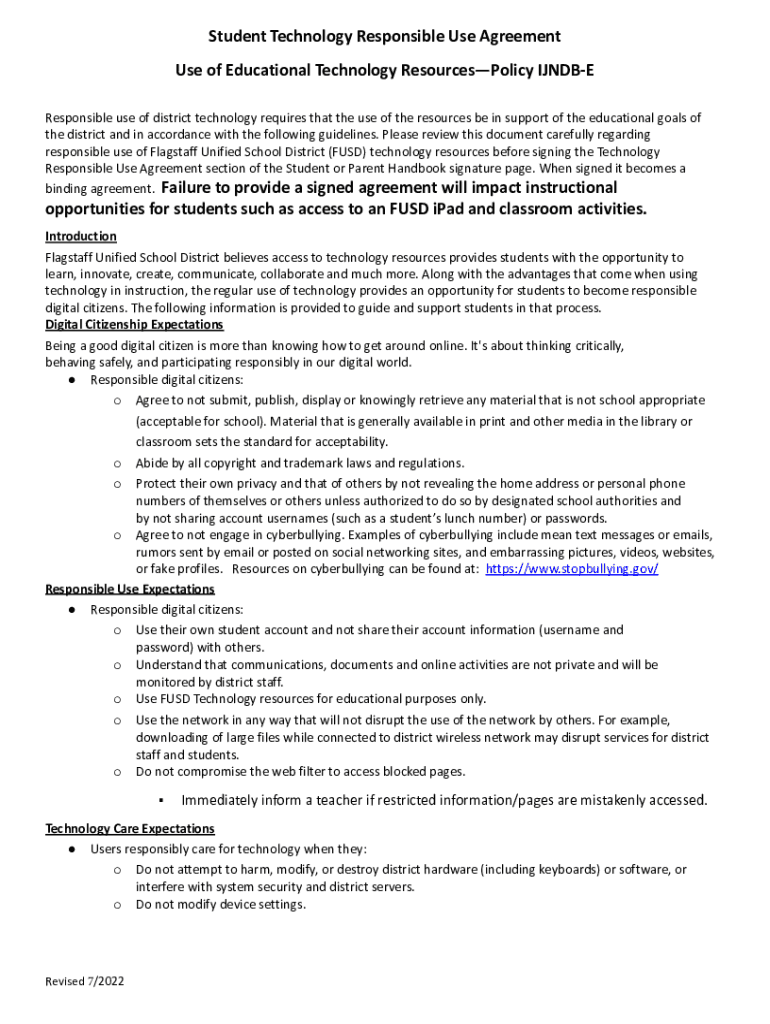 Student Technology Responsible Use Agreement Use of Educational Technology ResourcesPolicy INDIE Responsible use of district technology requires that the use of the resources be in support of the