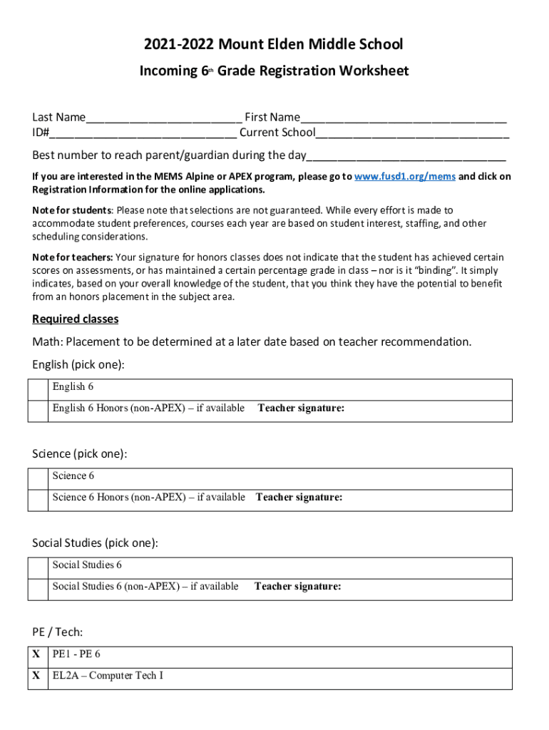 20212022 Mount Elder Middle School Incoming 6 Grade Registration Worksheet that Name___ First Name___ ID#___ Current School___ Best number to reach parent/guardian during the day___ If you are interested