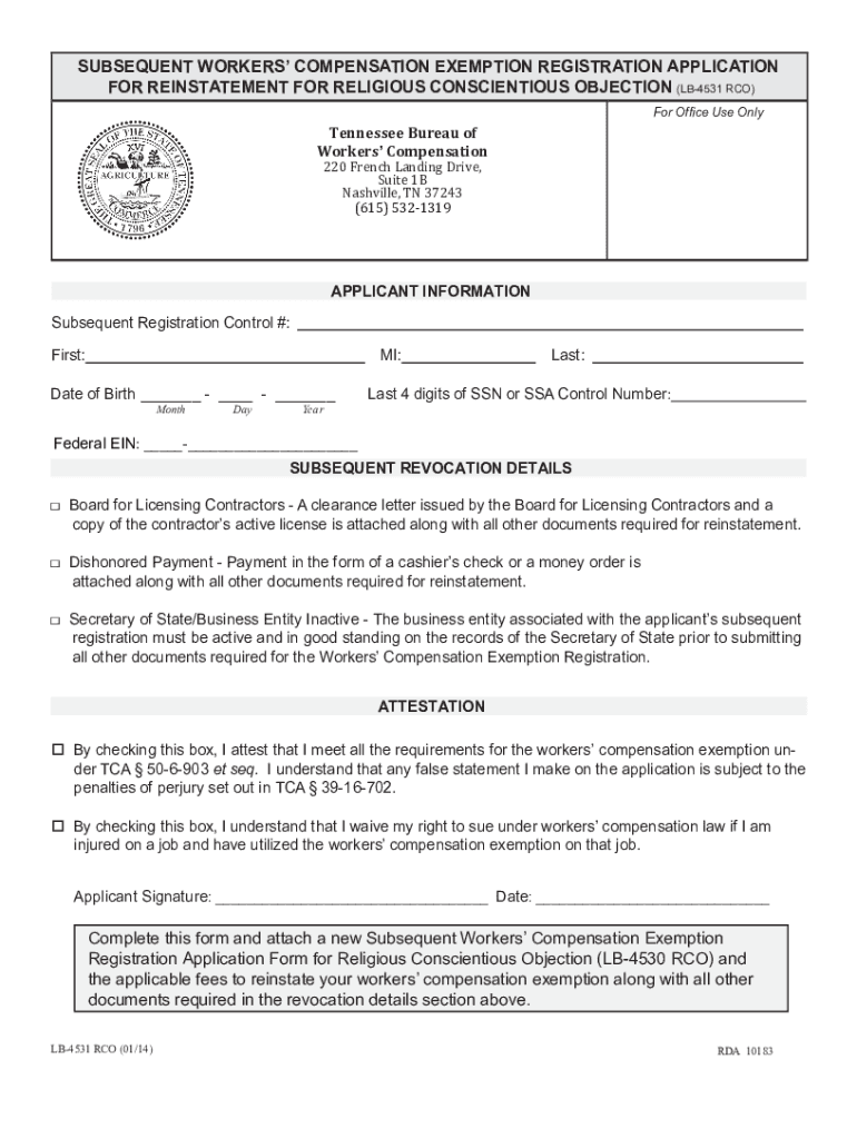 SUBSEQUENT WORKERS COMPENSATION EXEMPTION REGISTRATION APPLICATION FOR REINSTATEMENT FOR RELIGIOUS CONSCIENTIOUS OBJECTION (LB4531 RICO) For Office Use Only Tennessee Bureau of Workers Compensation