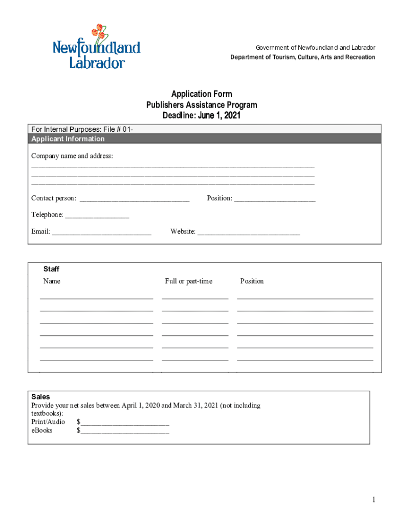 Government of Newfoundland and Labrador Department of Tourism, Culture, Arts and RecreationApplication Form Publishers Assistance Program Deadline: June 1, 2021, For Internal Purposes: File # 01Applicant