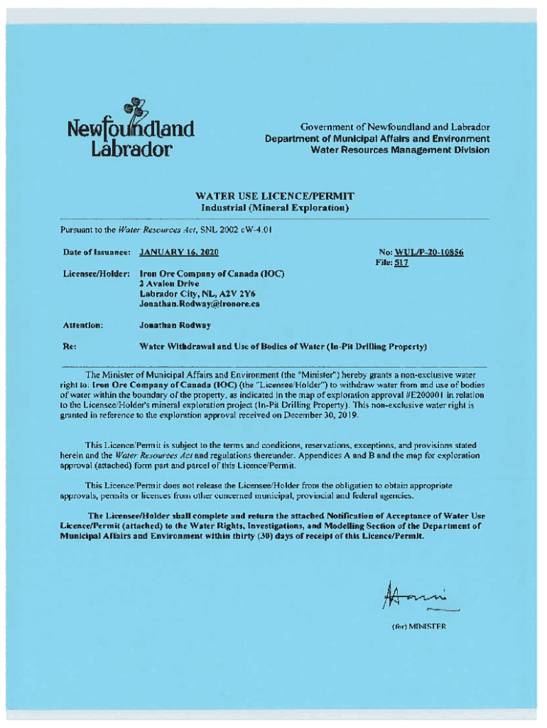 Newline.an.d. Government of Newfoundland and Labrador Department of Municipal Affairs and Environment Water Resources Management DivisionLabradorWATER USE LICENSE/PERCENT Industrial (Mineral Exploration)