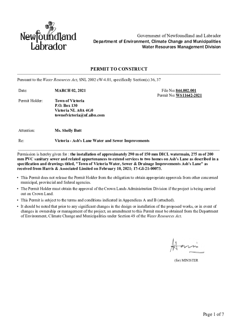 Government of Newfoundland and Labrador Department of Environment, Climate Change and Municipalities Water Resources Management DivisionPERMIT TO CONSTRUCT Pursuant to the Water Resources Act, SNL